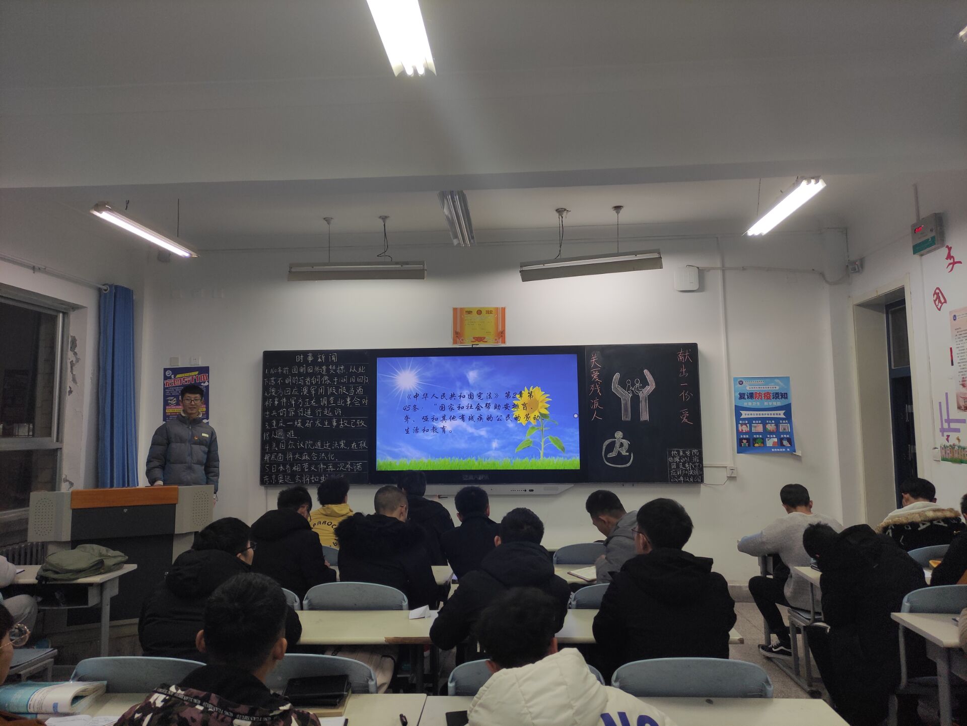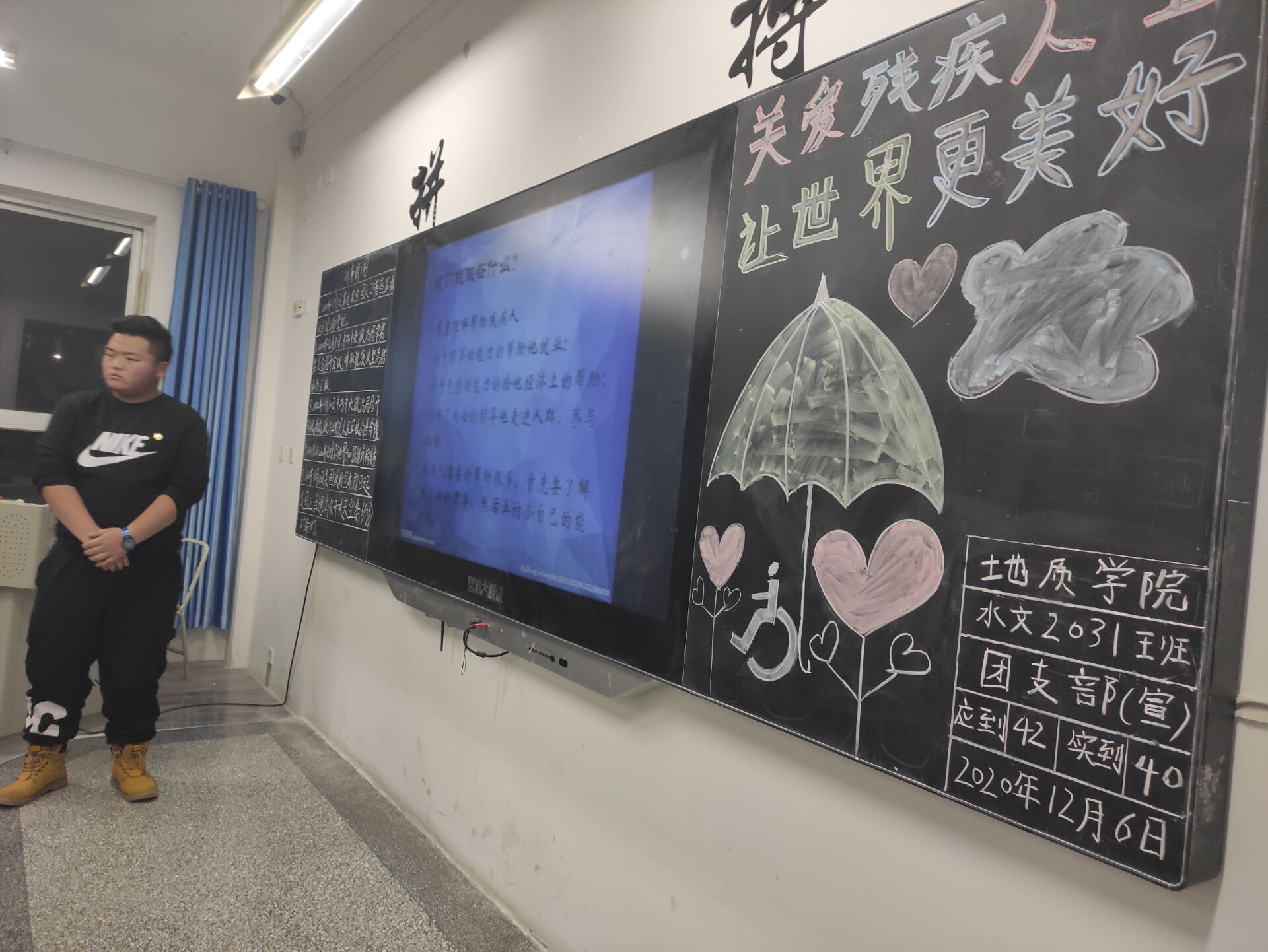 为了让同学们更好的建立一种关爱残疾人士的良好品德,树立一种善良的品质,进一步传递爱心,传播正能量,地质学院团总支于2020年12月6日组织20级全体同学在各班教室开展以“关爱残疾人士,让世界更加美好”的主题团课活动。