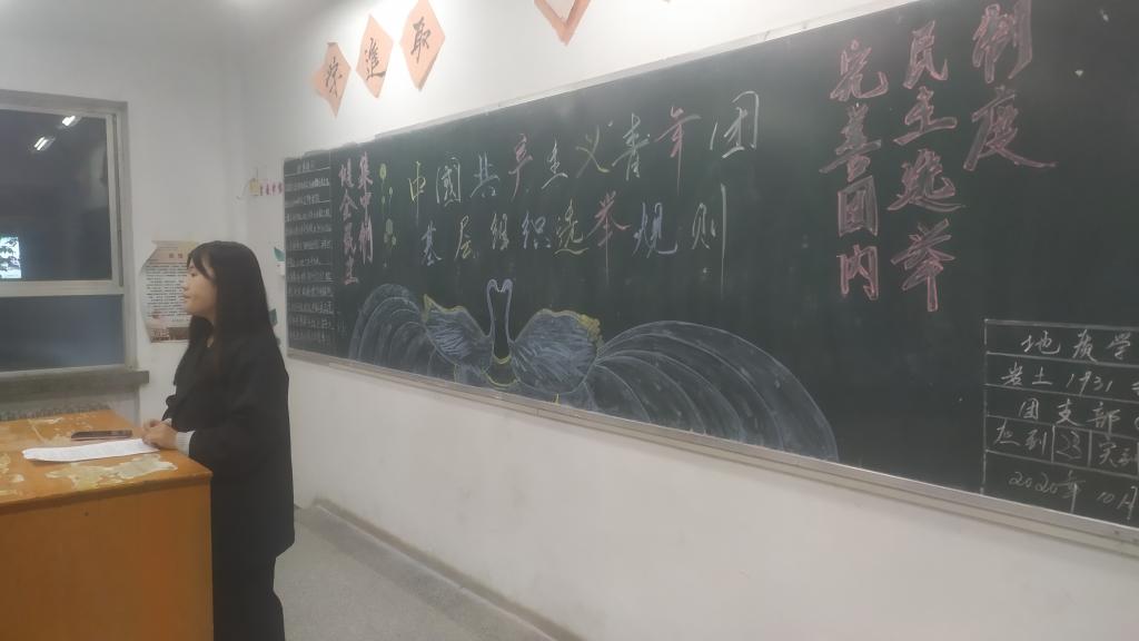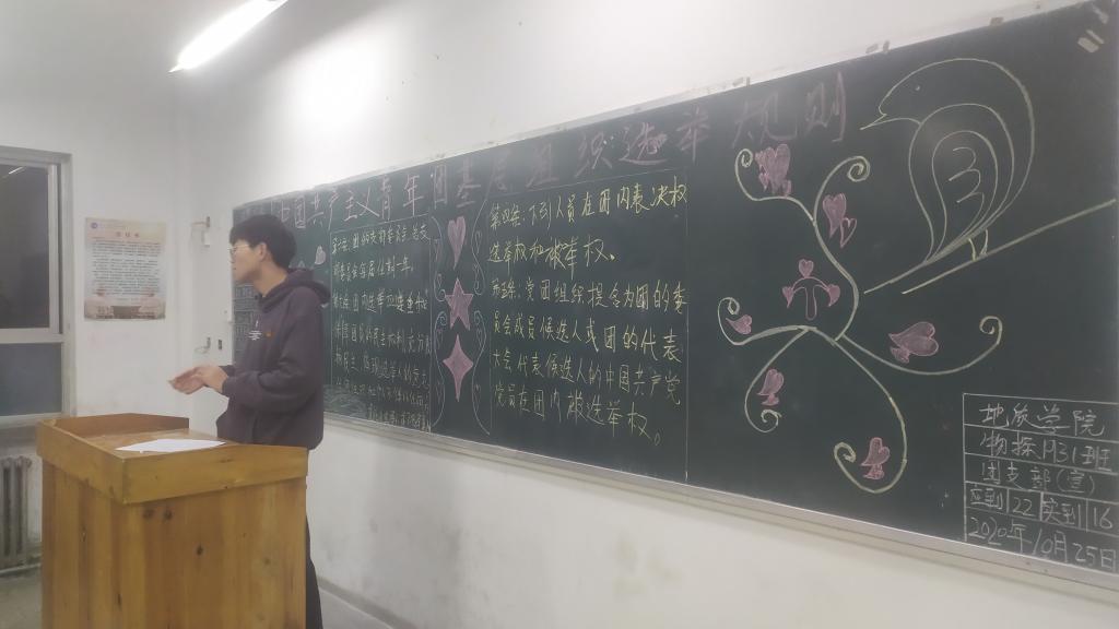 为加强我院团委的组织建设和基础工作,同时强化团员组织意识并学习态度,2020年10月25日晚,地质学院团总支组织全体同学在各班教室开展了以“中国共产主义青年团基层组织选举规则”为主题的团课。本次团课在地质学院全体同学的的积极筹备下,取得了良好的效果。