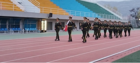 清晨,升旗仪式正式开始。国旗护卫队队员精神抖擞、步伐铿锵,护卫五星红旗走向升旗台。雄壮的《义勇军进行曲》响彻校园,全体师生肃立注目、高唱国歌,鲜艳的五星红旗迎着朝阳冉冉升起,爱国情怀与使命担当在每个人心中激荡。