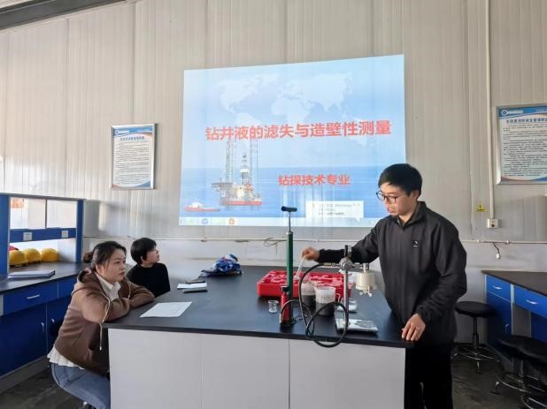 海存斌老师从钻井液滤失量的测定原理和测定方法两方面进行理论讲解,同时展示了钻井液的配置过程和滤失仪的操作方法。操作过程熟练,讲解简单明了易学,展现了良好的专业技能素养,受到了观摩老师的一致好评。