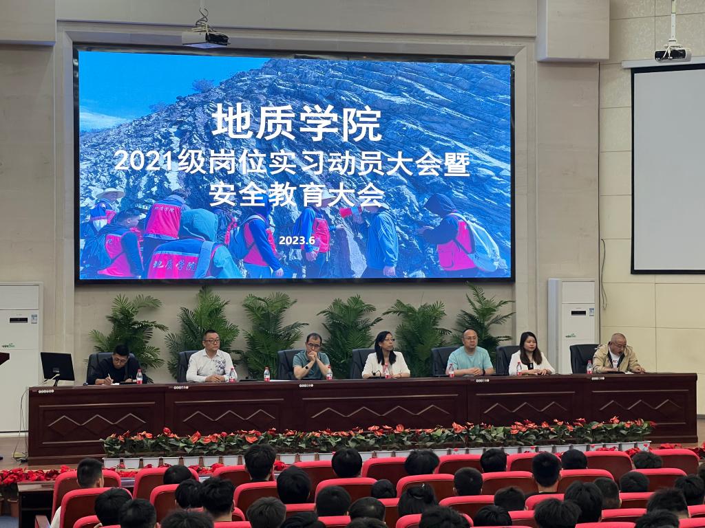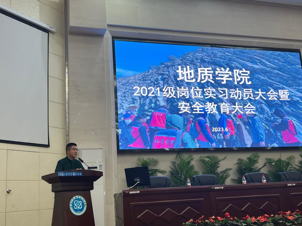 为确保2021级学生岗位实习安全有序进行,使同学们能够更快的进入实习阶段,融入实习单位,6月15日,地质学院按照学院教学安排,在校图书馆五楼报告厅召开岗位实习动员暨安全教育大会。地质学院班子成员、各专业主任、实习指导教师、班主任,以及即将离开校园,走上实习岗位的2021级六个专业所有同学参加大会,会议由办公室主任高全宝主持。