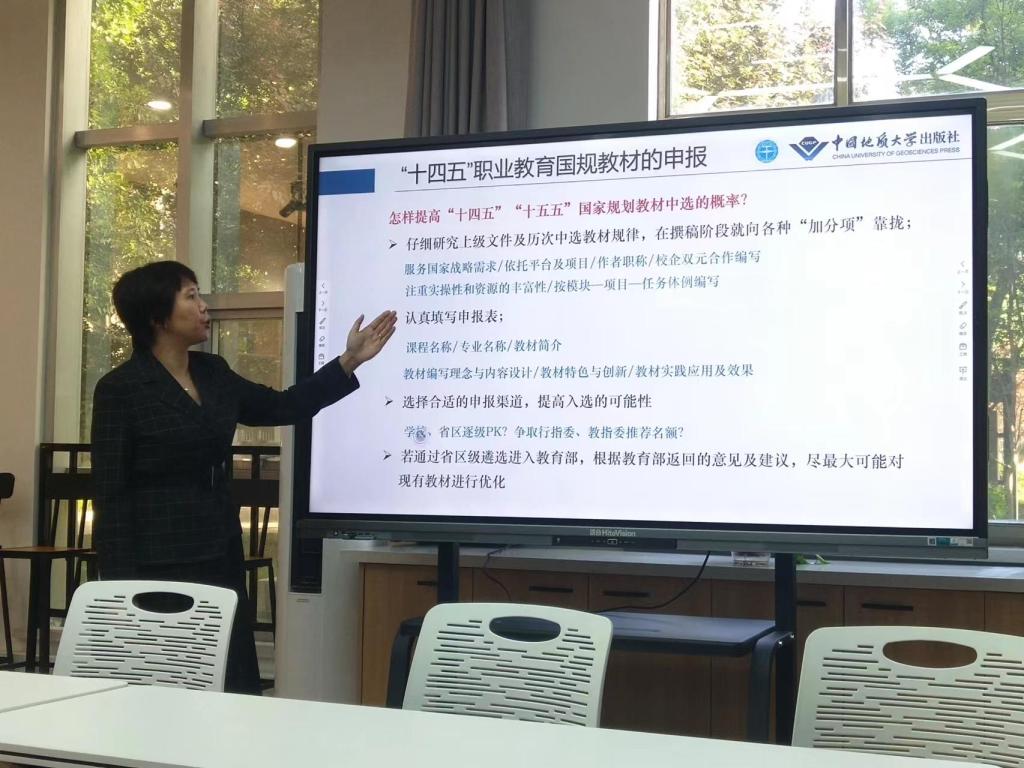 活动中,张琰副社长介绍了中国地质大学出版社的发展情况和课程教材建设现状,呈现了优秀案例和详实数据,重点针对职业教育国家规划教材和新形态活页式教材的开发建设提出了很多有建设性思路和特色突破路径。随后,参加活动的老师针对目前职业教育地质类专业教材存在的问题、解决方法与专家展开热烈讨论。通过专业指导和研讨活动,老师们进一步明确了新型教材编写的要求、教材出版业务审批程序,提升了教师的教育科研能力,为建设更多精品教材打下了坚实基础。