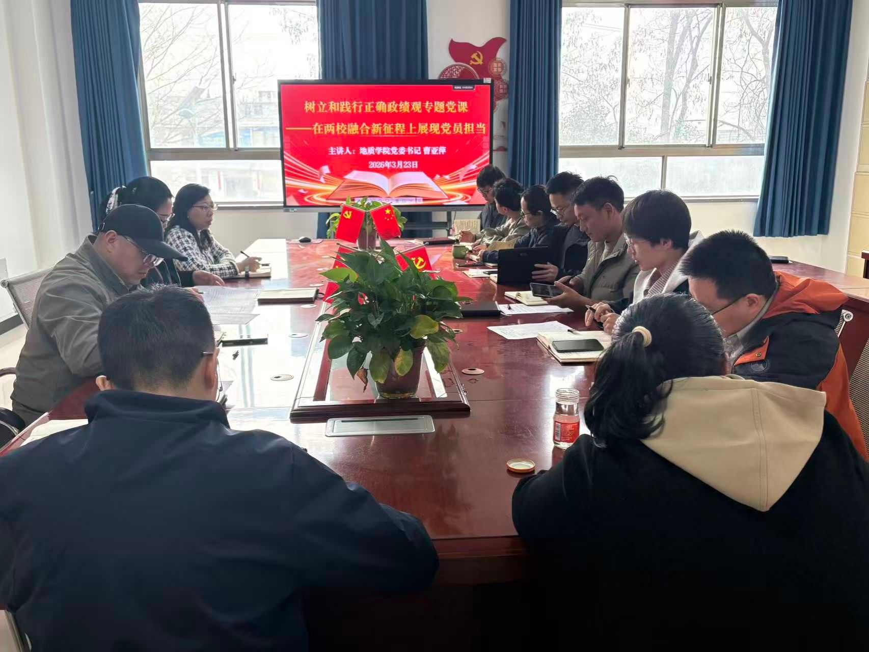 3月23日下午,地质学院在党建活动室开展树立和践行正确政绩观专题党课,学院党委书记曹亚萍以“树立和践行正确政绩观——在两校融合新征程上展现党员担当”为题,为全院党员讲授专题党课。