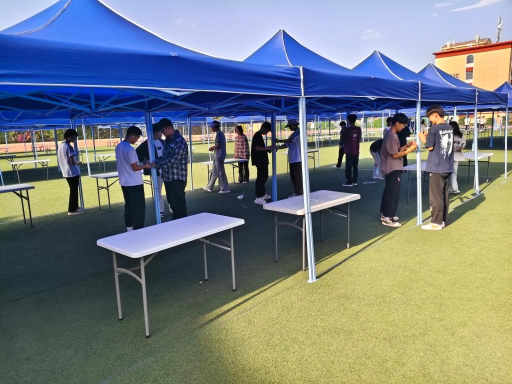 下午4时,烈日当空,志愿者们准时集合。在辅导员老师的指导下,同学们分为搬运组、搭建组、布置组三个小队,有序投入工作。搬运组同学往返于仓库与田径场之间,将百余张桌椅、30顶帐篷及企业展牌运送至指定区域;搭建组同学两两配合,熟练组装帐篷支架、铺设防雨布;布置组则根据规划图纸精准划分企业展位,张贴标识,确保场地整齐规范。经过2小时连续奋战,所有展位布置完毕,场地焕然一新。