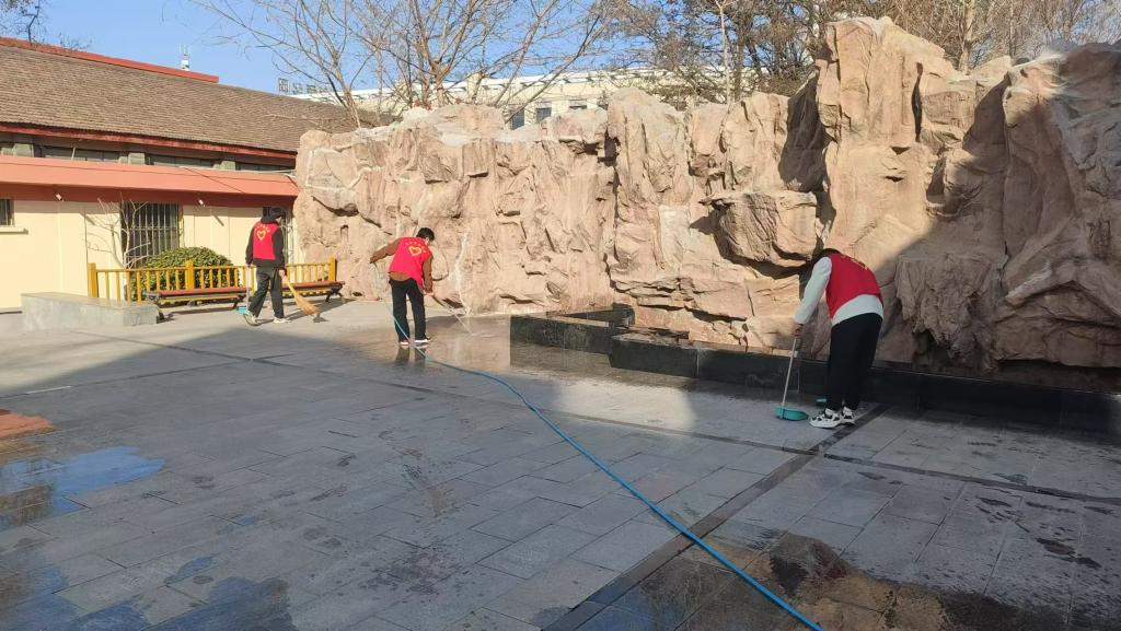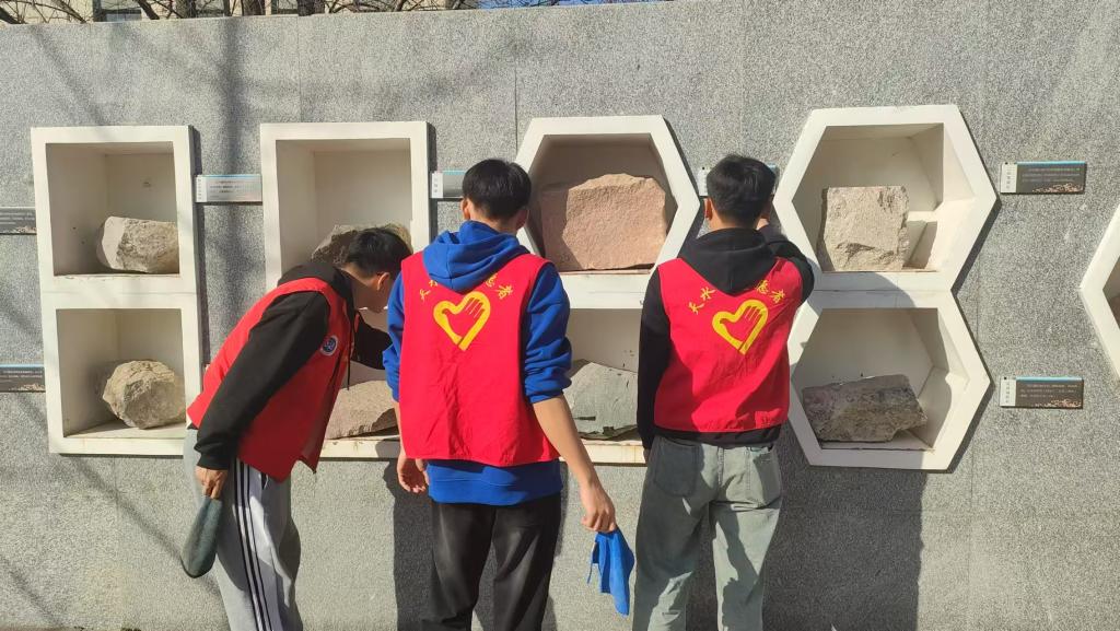 志愿服务过程中,志愿者们携带清洁工具,认真清理区域内的岩石标本、宣传展架、坑道污渍;他们有序分工、齐心协力,细心擦拭,不放过任何角角落落的灰尘和垃圾,为地质园的环境增添了“春天的绿意”。