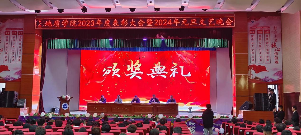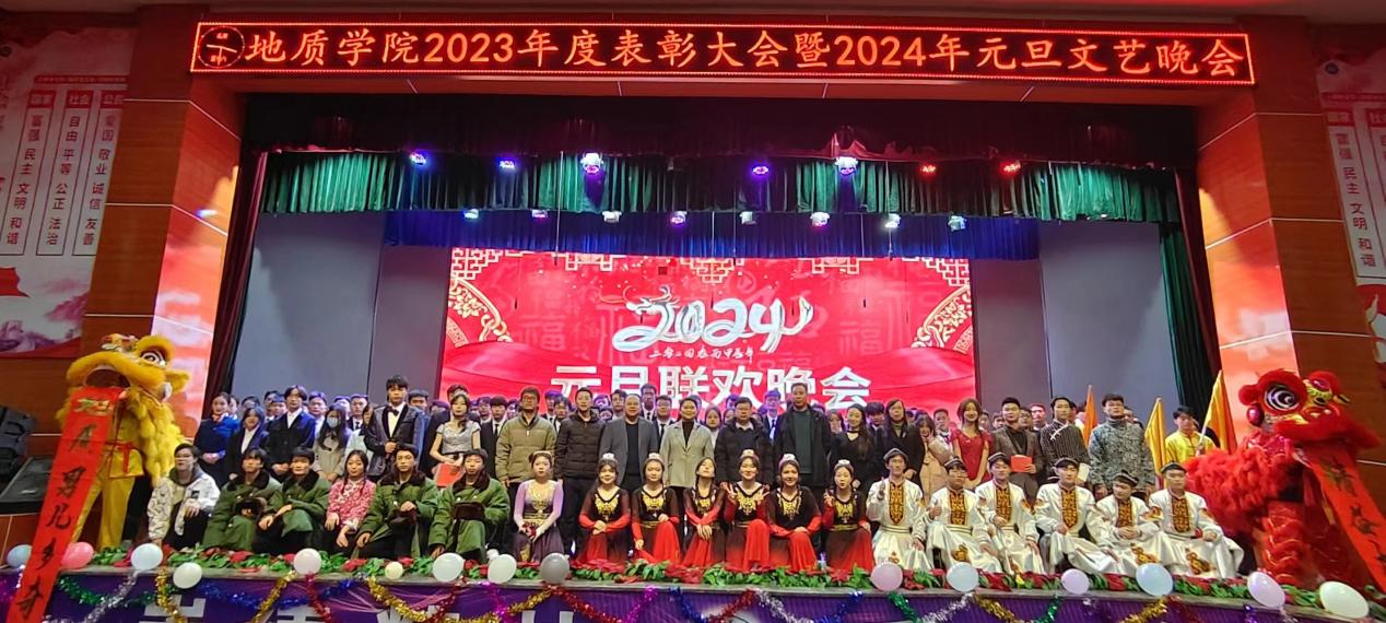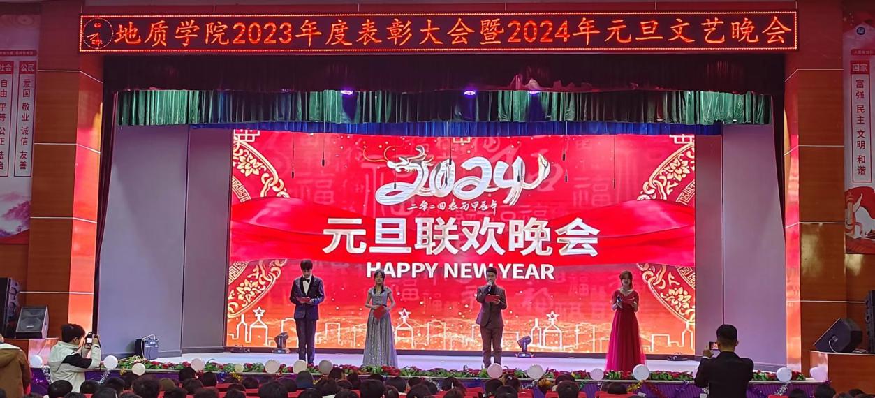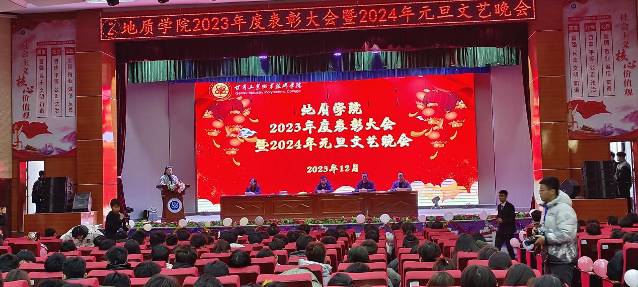 欢歌辞旧岁,起舞迎新年,2023年12月23日晚,地质学院2023-2024学年表彰大会暨元旦文艺晚会在大学生活动中心隆重举行,甘肃工业职业技术学院党委委员、副院长曹惠清同志与地质学院各位领导莅临参会,到场的还有地质学院全体教师、校学生会、广播站、学院各社团代表、各二级学院学生骨干,他们与地质学院广大同学一起带着对新一年的美好期盼欢聚一堂、共庆元旦。